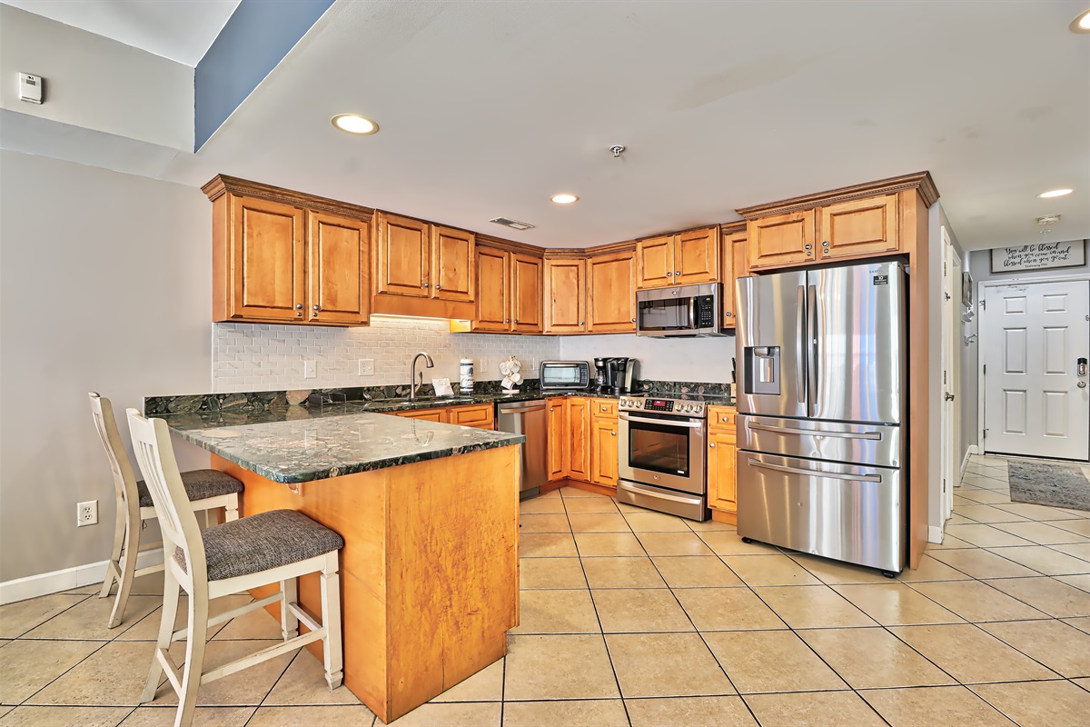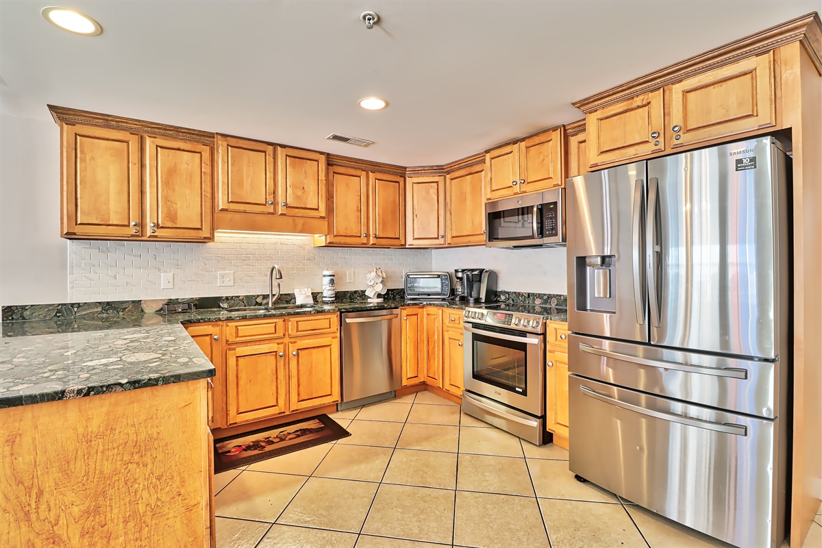 Full Kitchen with coffee maker, microwave, refrigerator, dishwasher, toaster, oven, cookware, flatware