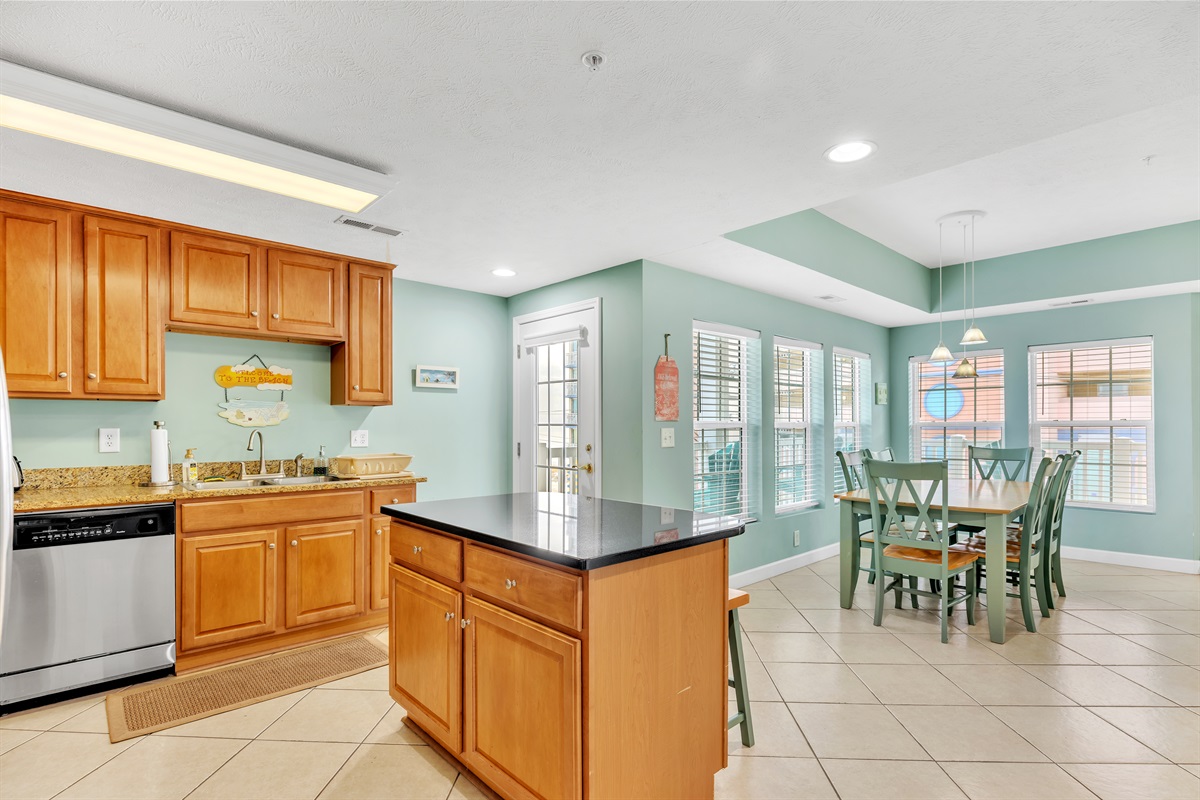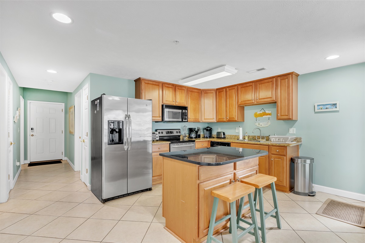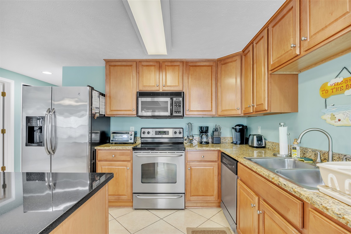 Full Kitchen with coffee maker, microwave, refrigerator, dishwasher, toaster, oven, cookware, flatware