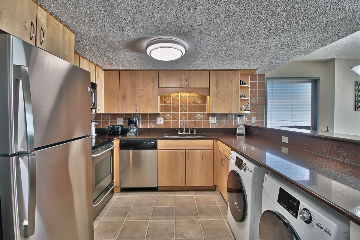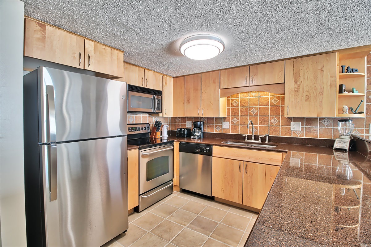 Full Kitchen with coffee and tea maker, microwave, refrigerator, dishwasher toaster, oven, cookware, flatware
